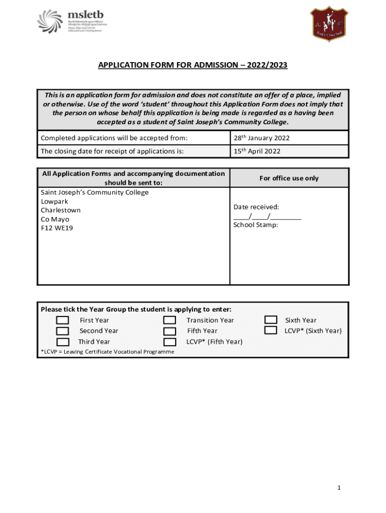 APPLICATION FORM FOR ADMISSION 2022/2023This is an application form for admission and does not constitute an offer of a place, implied or otherwise. Use of the word student throughout this Application