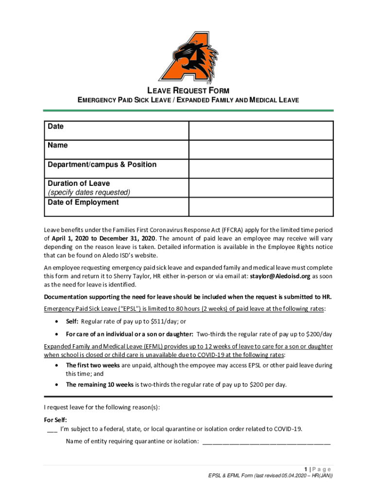 LEAVE REQUEST FORM EMERGENCY PAID SICK LEAVE / EXPANDED FAMILY AND MEDICAL LEAVED ate Name Department/campus & Position Duration of Leave (specify dates requested) Date of EmploymentLeave benefits