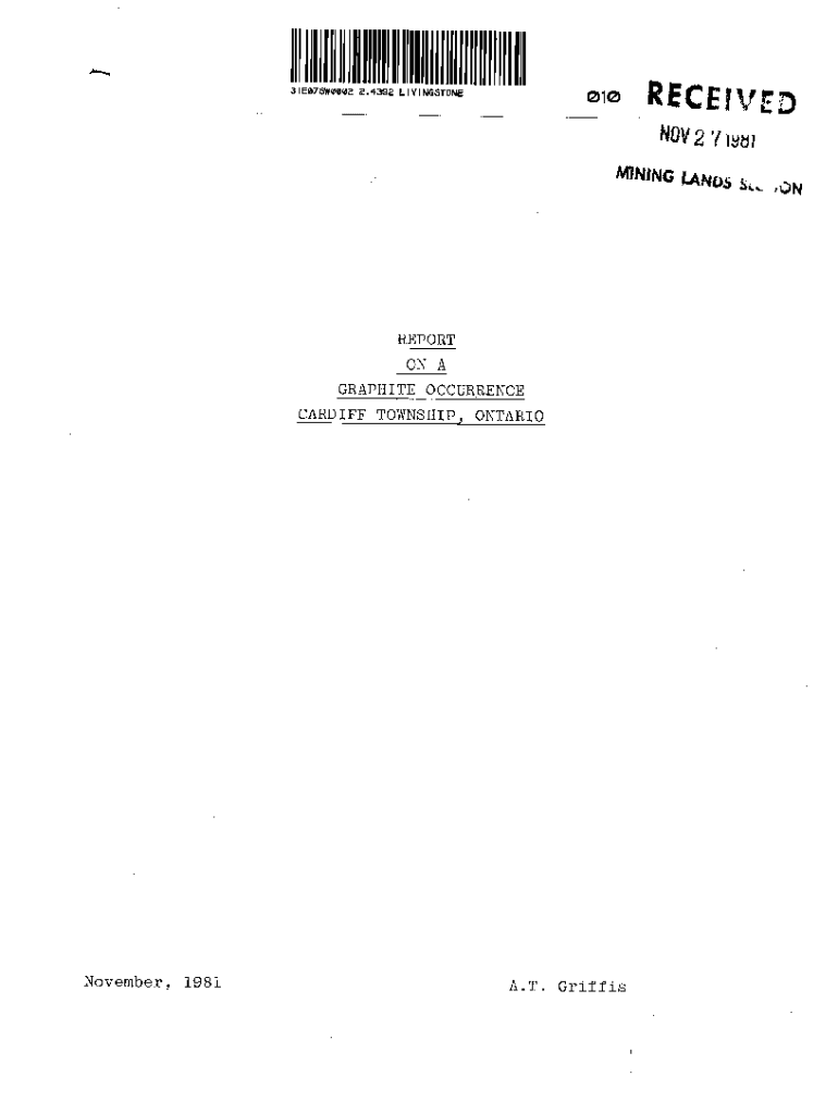 1I11111111 ITII 1111 31E07SW0002 2.4392 LIVINGSTONE010REC:E\”\'ED NOV 2 7 mining L4. NOC:.oil ........, \'VN ....REPORT ON A GRAPHITE OCCURRENCE CARDIFF TOWNSHIP, ONTARIONovember, 1981A. T. GriffisTEXT