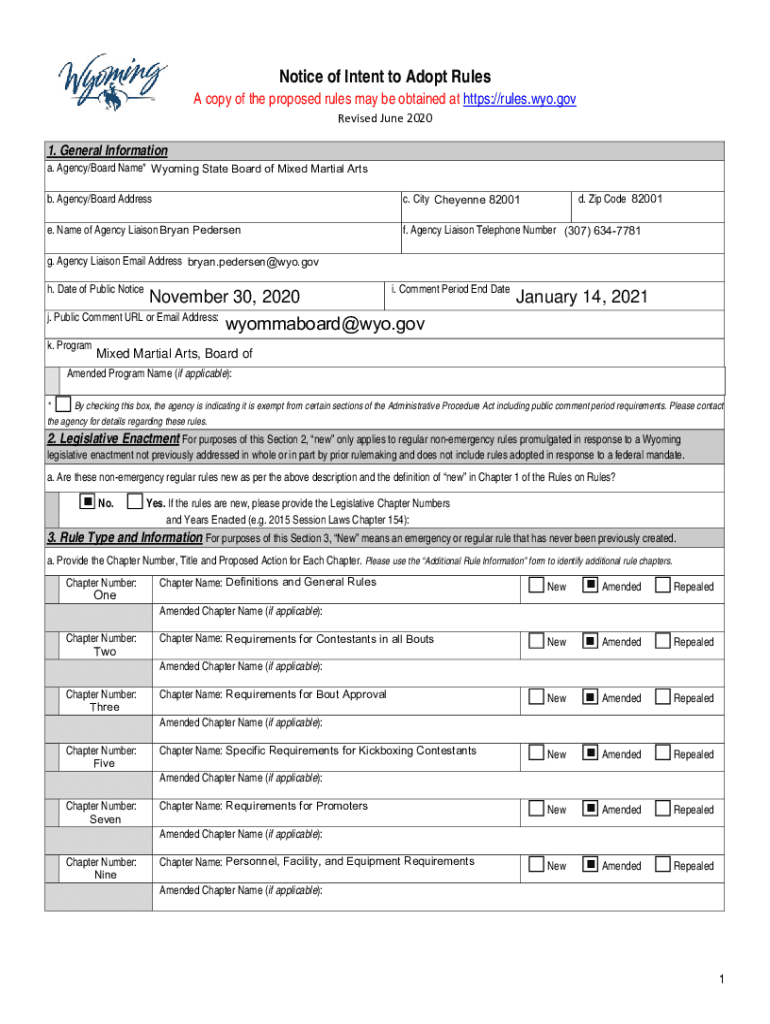 Notice of Intent to Adopt Rules A copy of the proposed rules may be obtained at https://rules.wyo.gov RevisedJune2020 1. General Information a. Agency/Board Name* b. Agency/Board Address. City. Zip