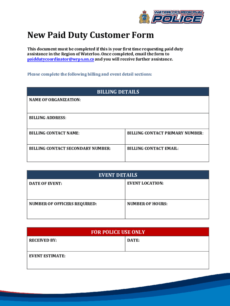 New Paid Duty Customer Form This document must be completed if this is your first time requesting paid duty assistance in the Region of Waterloo. Once completed, email the form to paiddutycoordinator@wrps.on.ca,