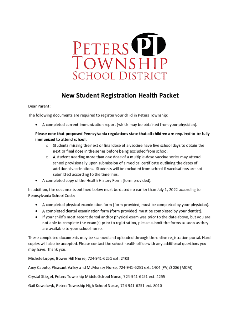 New Student Registration Health Packet Dear Parent: The following documents are required to register your child in Peters Township: A completed current immunization report (which may be obtained from