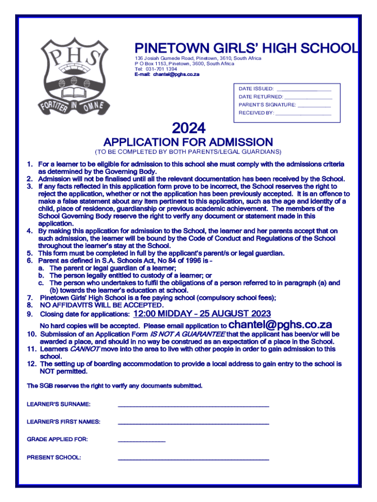 Students who are looking to apply to Pinetown Girls High and prefer to do so online