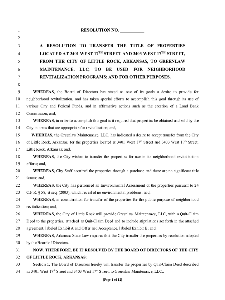 RESOLUTION NO. ___1 2 3A RESOLUTION TO TRANSFER THE TITLE OF PROPERTIES4LOCATED AT 3401 WEST 17TH STREET AND 3403 WEST 17TH STREET,5FROM THE CITY OF LITTLE ROCK, ARKANSAS, TO GREENLAW6MAINTENANCE,7REVITALIZATION