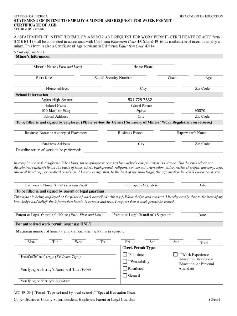STATE OF CALIFORNIADEPARTMENT OF EDUCATIONSTATEMENT OF INTENT TO EMPLOY A MINOR AND REQUEST FOR WORK PERMIT CERTIFICATE OF AGE CDE B11 (Rev. 0710)A STATEMENT OF INTENT TO EMPLOY A MINOR AND REQUEST
