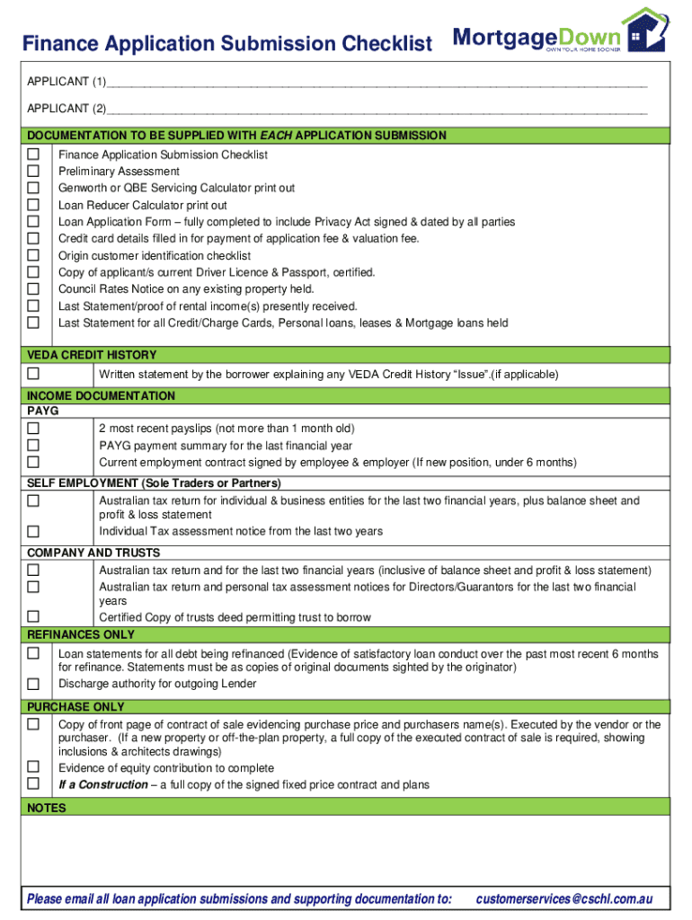 Finance Application Submission Checklist is not the form you're looking for?Search for another form here.