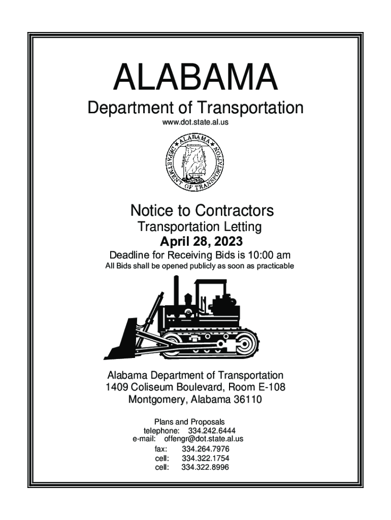 ALABAMA Department of Transportation www.dot.state.al.usNotice to Contractors Transportation Letting April 28, 2023Deadline for Receiving Bids is 10:00 small Bids shall be opened publicly as soon