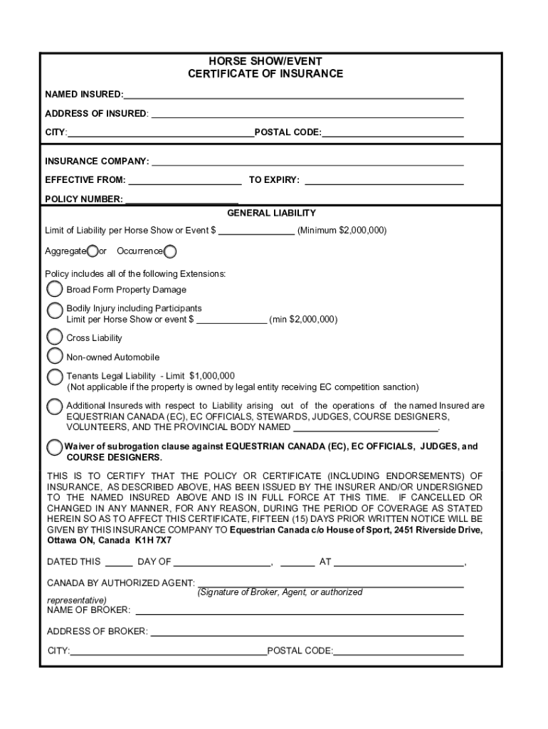 HORSE SHOW/EVENT CERTIFICATE OF INSURANCE NAMED INSURED: ADDRESS OF INSURED: CITY:POSTAL CODE:INSURANCE COMPANY: EFFECTIVE FROM:TO EXPIRY:POLICY NUMBER: GENERAL LIABILITY Limit of Liability per Horse