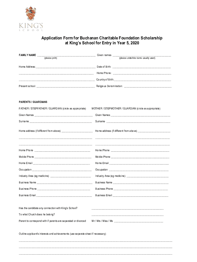 Application Form for Buchanan Charitable Foundation Scholarship at Kings School for Entry in Year 5, 2020 FAMILY NAME ___ Given names ___ (please print)(please underline name usually used)Home Address:___