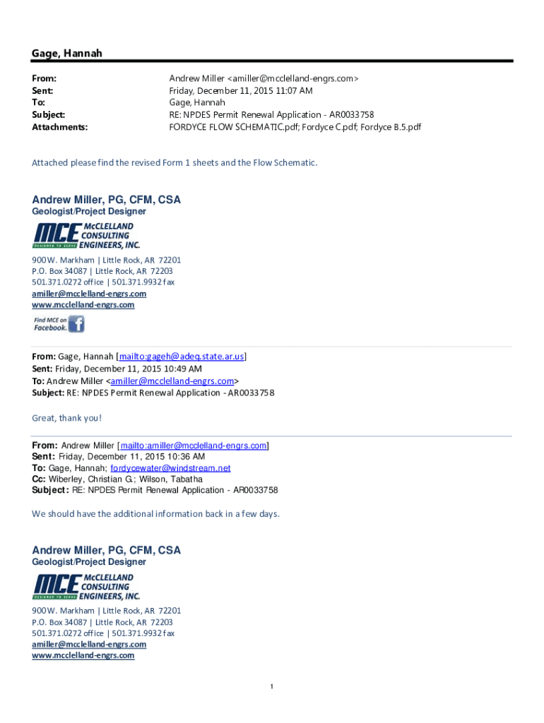 Gage, Hannah From: Sent: To: Subject: Attachments:Andrew Miller amiller@mcclellandengrs.com Friday, December 11, 2015 11:07 AM Gage, Hannah RE: NODES Permit Renewal Application AR0033758 FORCE FLOW