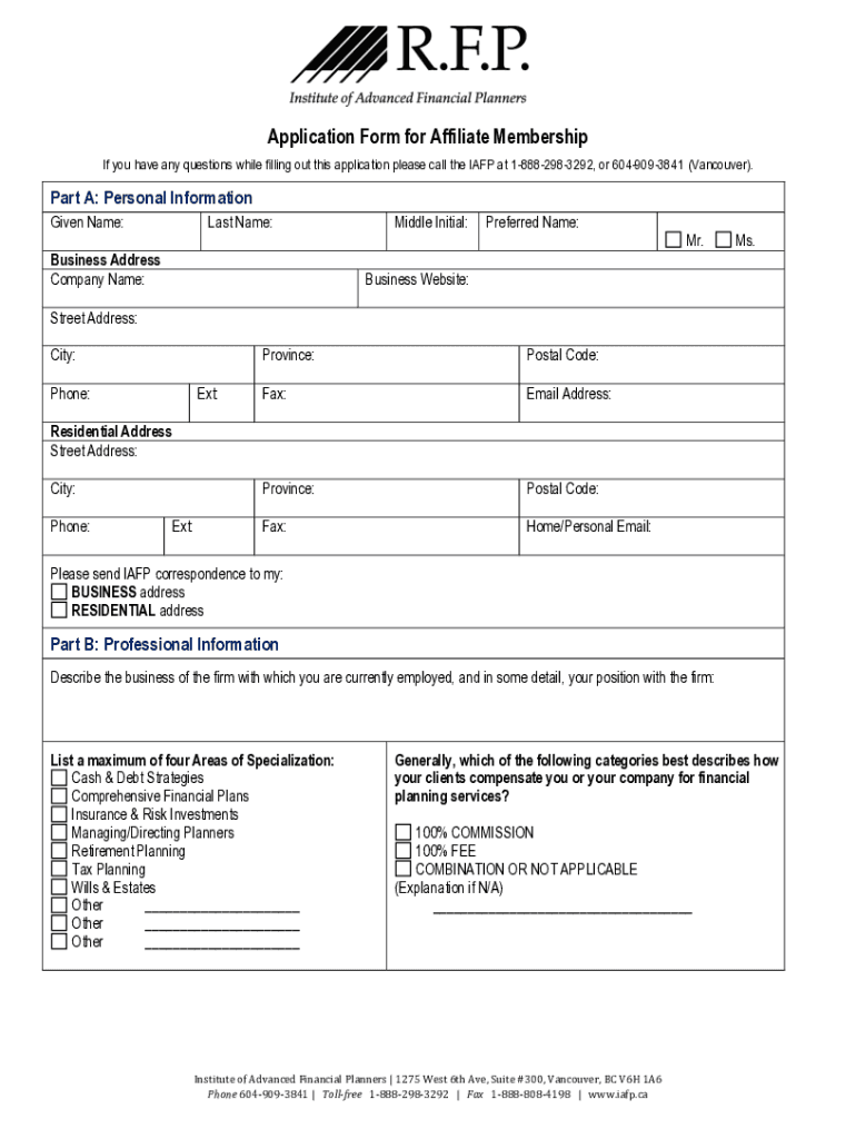 Application Form for Affiliate Membership If you have any questions while filling out this application please call the IAP at 18882983292, or 6049093841 (Vancouver). Part A: Personal Information Last