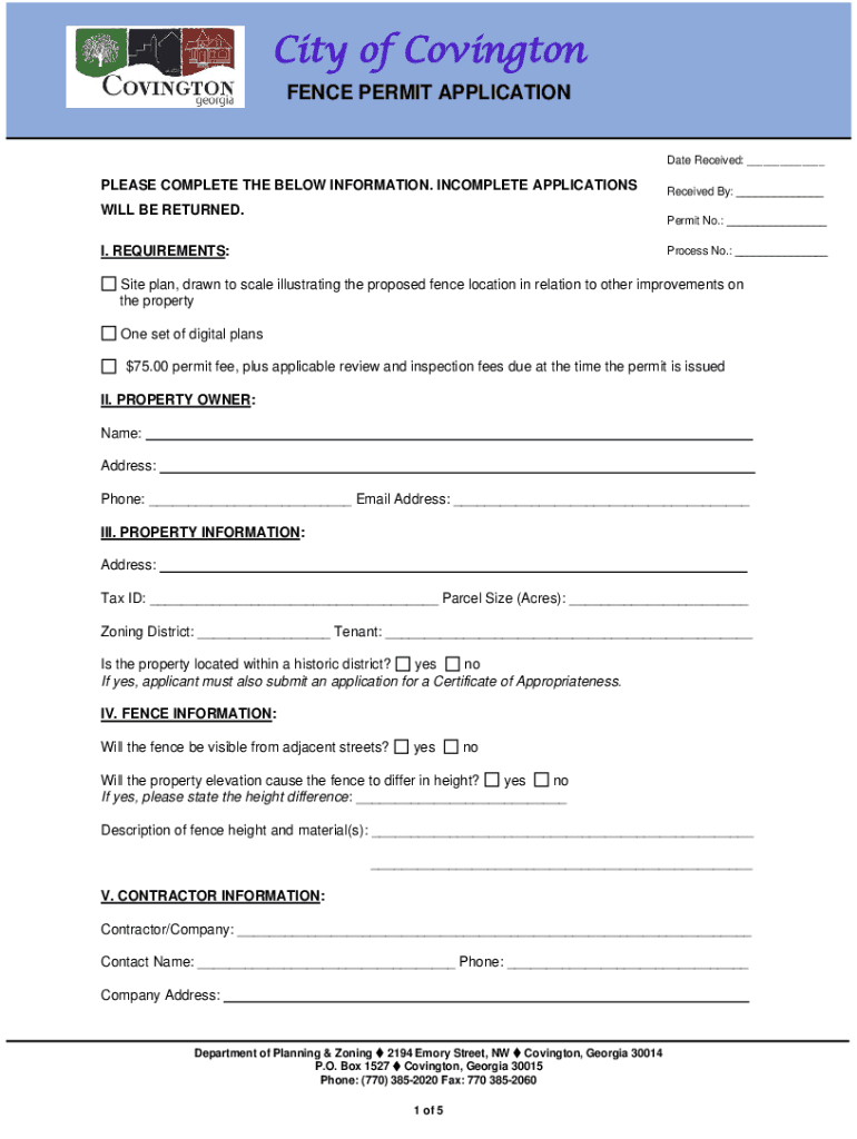 City of Covington FENCE PERMIT APPLICATION Date Received: ___PLEASE COMPLETE THE BELOW INFORMATION. INCOMPLETE APPLICATIONS WILL BE RETURNED. Received By: ___ Permit No.: ___I. REQUIREMENTS:Process