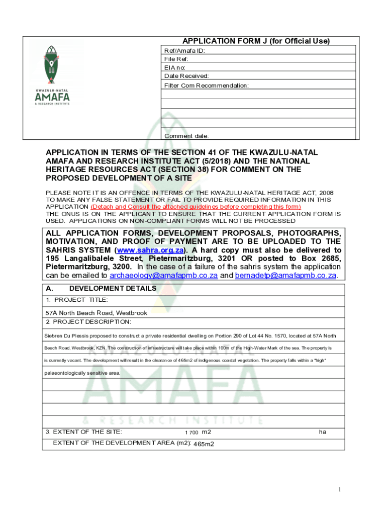 APPLICATION FORM J (for Official Use) Ref/Amapá ID: File Ref: EIA no: Date Received: Filter Com Recommendation:Comment date:APPLICATION IN TERMS OF THE SECTION 41 OF THE KWAZULUNATAL AM AFA AND RESEARCH