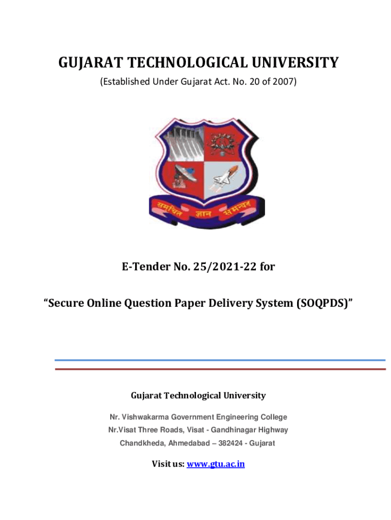GUJARAT TECHNOLOGICAL UNIVERSITY (Established Under Gujarat Act. No. 20 of 2007)Tender No. 25/202122 for Secure Online Question Paper Delivery System (SOUNDS)Gujarat Technological University NR. Vishwakarma