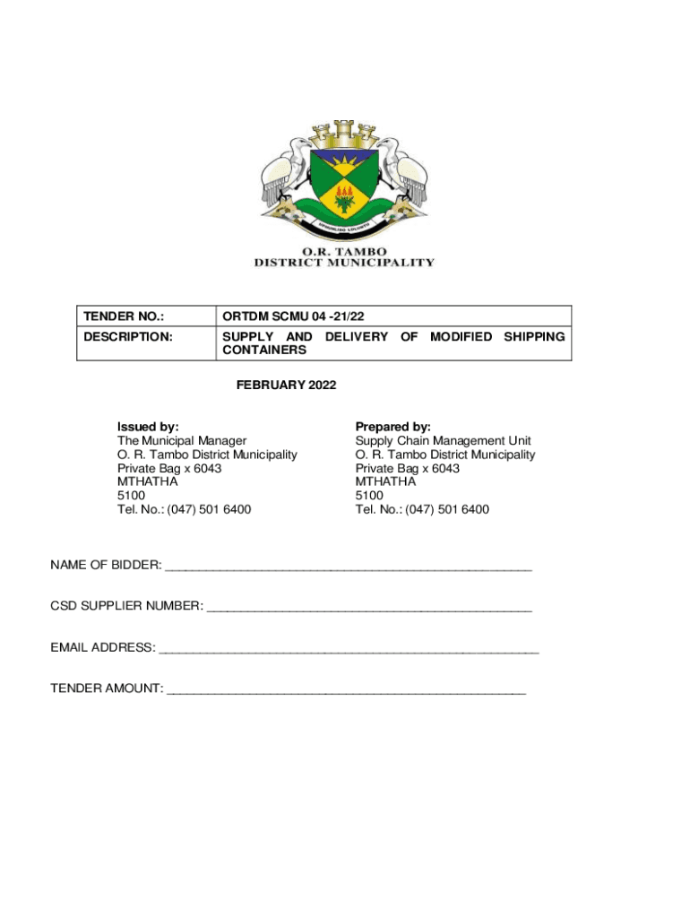 TENDER NO.:OR TDM CMU 04 21/22DESCRIPTION:SUPPLY AND DELIVERY OF MODIFIED SHIPPING CONTAINERS FEBRUARY 2022Issued by: The Municipal Manager O. R. Rambo District Municipality Private Bag x 6043 MARATHA
