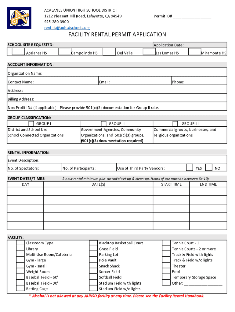 ABALONES UNION HIGH SCHOOL DISTRICT 1212 Pleasant Hill Road, Lafayette, CA 94549 9252803900 rentals@auhsdschools.orgPermit ID# ___FACILITY RENTAL PERMIT APPLICATIONSCHOOL SITE REQUESTED: ___ Abalones