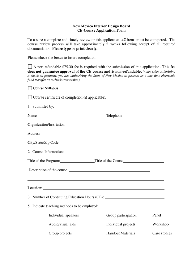 New Mexico Interior Design Board CE Course Application Form To assure a complete and timely review or this application, all items must be completed. The course review process will take approximately