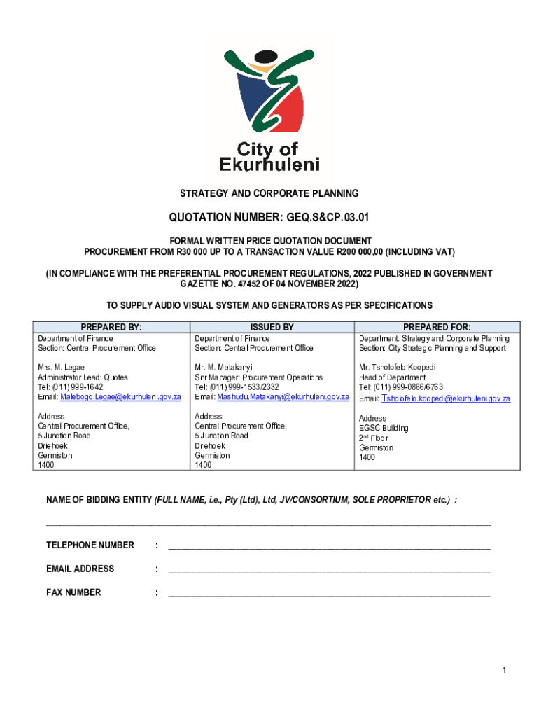 STRATEGY AND CORPORATE PLANNINGQUOTATION NUMBER: GEQ. SCP.03.01 FORMAL WRITTEN PRICE QUOTATION DOCUMENT PROCUREMENT FROM R30 000 UP TO A TRANSACTION VALUE R200 000,00 (INCLUDING VAT) (IN COMPLIANCE