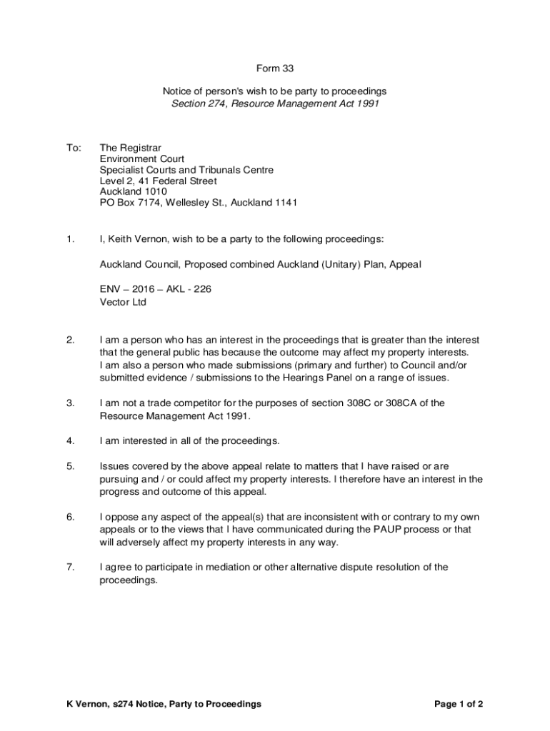 Form 33 Notice of person\'s wish to be party to proceedings Section 274, Resource Management Act 1991To:The Registrar Environment Court Specialist Courts and Tribunals Center Level 2, 41 Federal Street