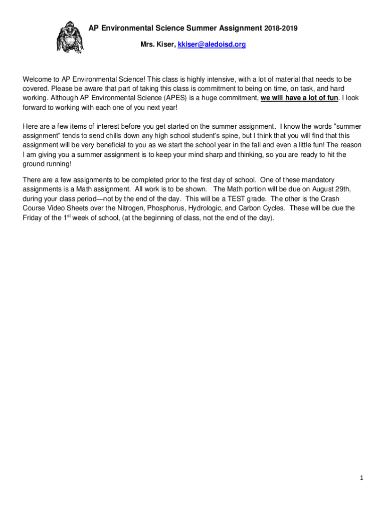 AP Environmental Science Summer Assignment 20182019 Mrs. Kaiser, kkiser@aledoisd.orgWelcome to AP Environmental Science! This class is highly intensive, with a lot of material that needs to be covered.