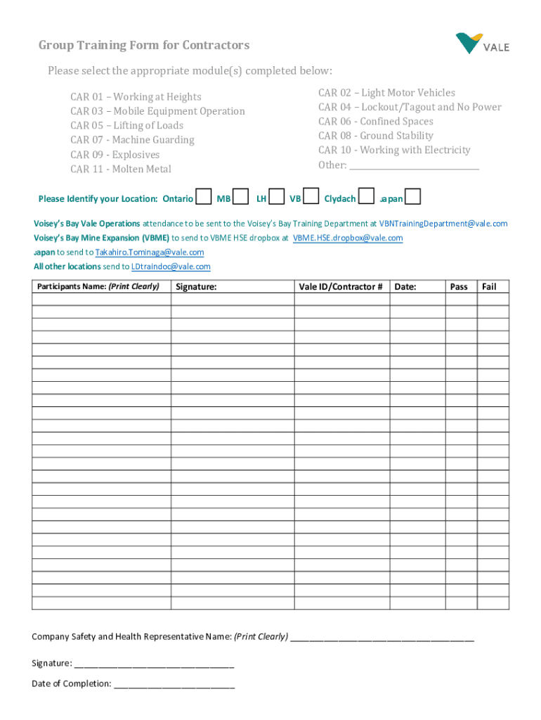 Group Training Form for Contractors Please select the appropriate module(s) completed below: CAR 01 Working at Heights CAR 03 Mobile Equipment Operation CAR 05 Lifting of Loads CAR 07 Machine Guarding