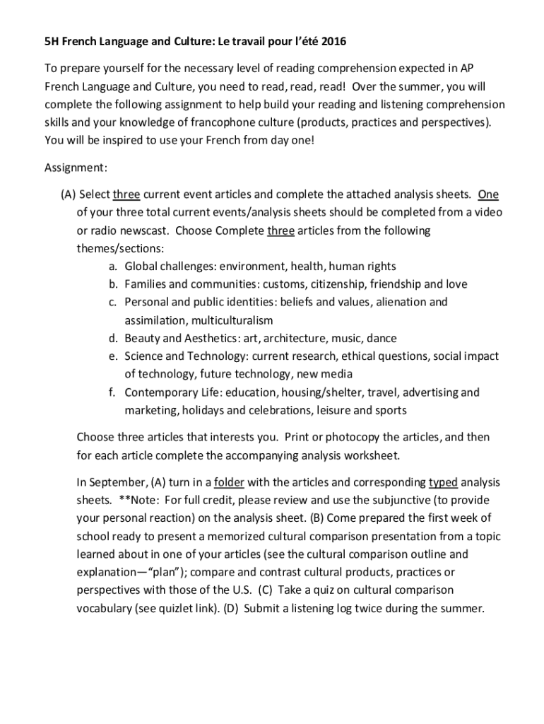 5H French Language and Culture: Le travail pour Lt 2016 To prepare yourself for the necessary level of reading comprehension expected in AP French Language and Culture, you need to read, read, read!