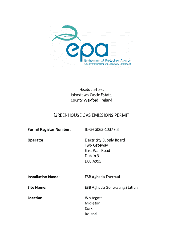 Headquarters, Johnstown Castle Estate, County Oxford, IrelandGREENHOUSE GAS EMISSIONS PERMIT Register Number:IEGHG063103773Operator:Electricity Supply Board Two Gateway East Wall Road Dublin 3 D03