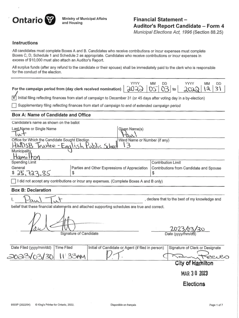 OntarioMinistry of Municipal Affairs and HousingFinancial Statement Auditor\'s Report Candidate Form 4 Municipal Elections Act, 1996 (Section 88.25)Instructions All candidates must complete Boxes