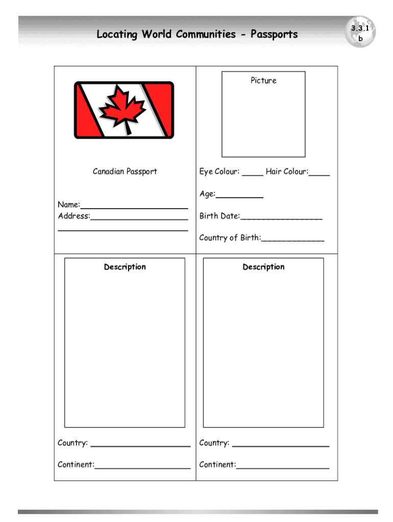 Locating World Communities PassportsPictureCanadian Passport Color:Hair Color:Age:Name: Address:Birth Date:___ Country of Birth:___ DescriptionDescriptionCountry:Country:Continent:Continent:3.3.1