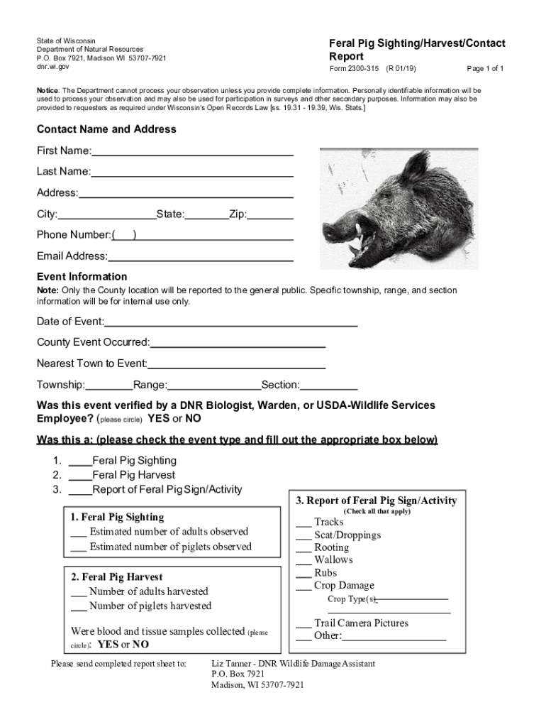 State of Wisconsin Department of Natural Resources P.O. Box 7921, Madison WI 537077921 DNR.WI.several Pig Sighting/Harvest/Contact Report Form 2300315(R 01/19)Page 1 of 1Notice: The Department cannot