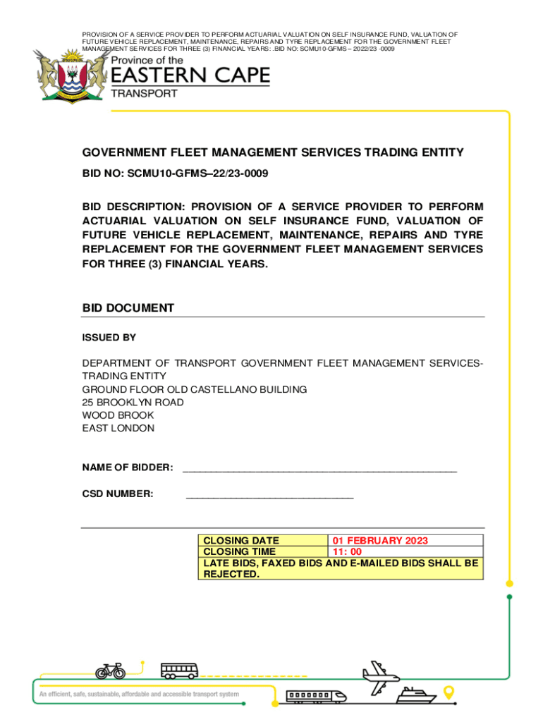 PROVISION OF A SERVICE PROVIDER TO PERFORM ACTUARIAL VALUATION ON SELF INSURANCE FUND, VALUATION OF FUTURE VEHICLE REPLACEMENT, MAINTENANCE, REPAIRS AND TYRE REPLACEMENT FOR THE GOVERNMENT FLEET MANAGEMENT