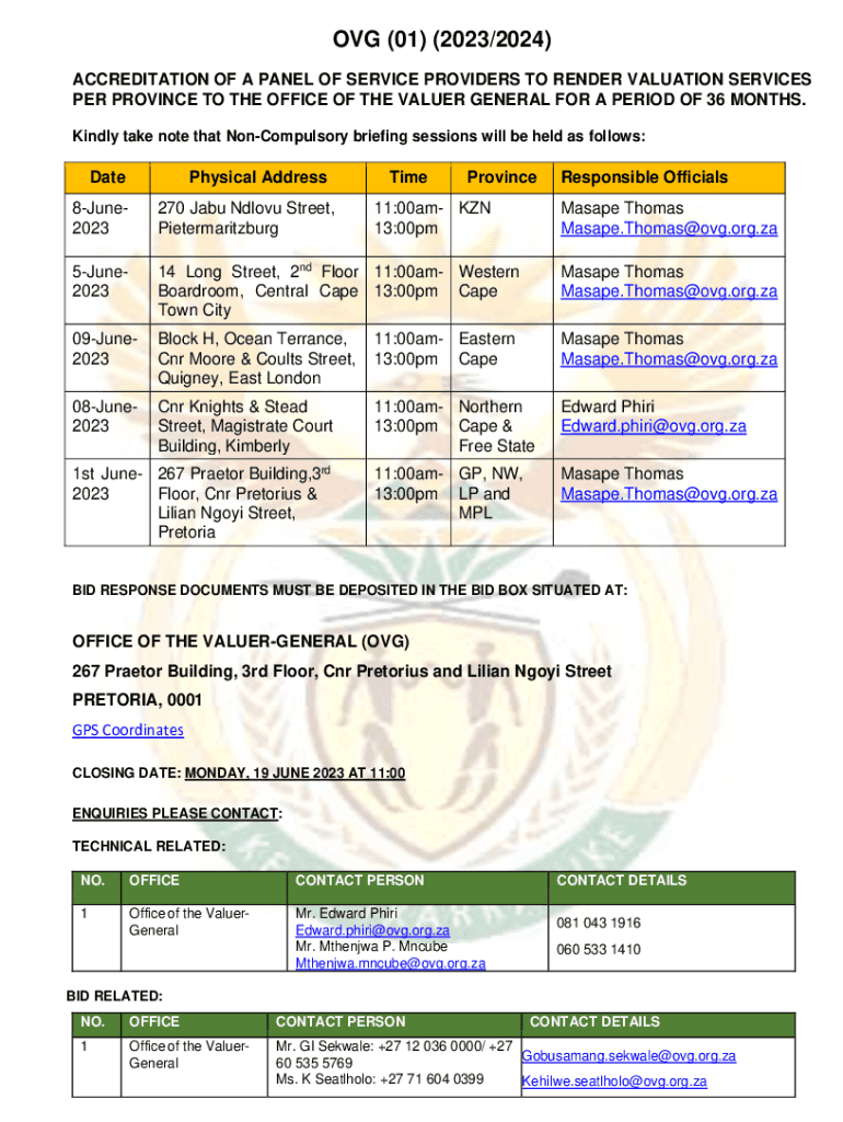 AVG (01) (2023/2024) ACCREDITATION OF A PANEL OF SERVICE PROVIDERS TO RENDER VALUATION SERVICES PER PROVINCE TO THE OFFICE OF THE VALUER GENERAL FOR A PERIOD OF 36 MONTHS. Kindly take note that Compulsory