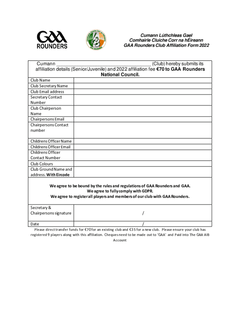 Human Cochleas Gael Compared Cliché Corr Na Hermann GAA Rounders Club Affiliation Form 2022Cumann ___ (Club) hereby submits its affiliation details (Senior/Juvenile) and 2022 affiliation fee 70 to