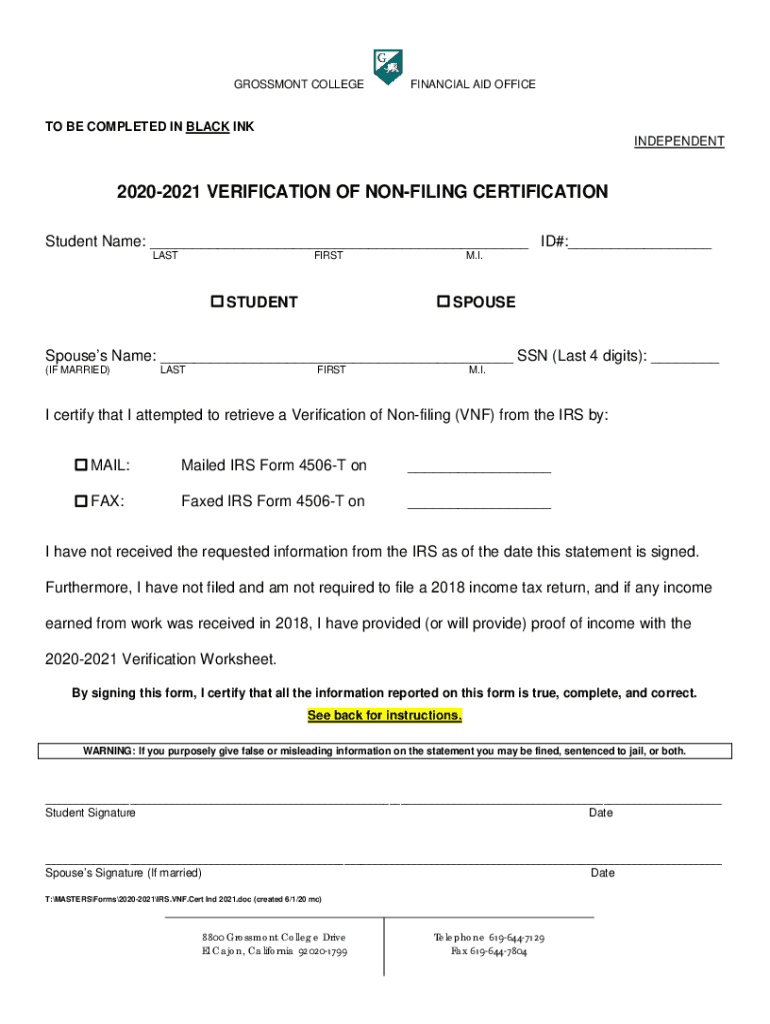 GROSSMAN COLLEGEFINANCIAL AID OFFICE TO BE COMPLETED IN BLACK INK INDEPENDENT20202021 VERIFICATION OF CONFINING CERTIFICATION Student Name: ___ ID#:___ LASTFIRSTSTUDENTM. I.SPOUSESpouses Name: ___
