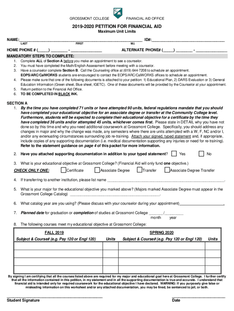 GROSSMAN COLLEGEFINANCIAL AID OFFICE20192020 PETITION FOR FINANCIAL AID Maximum Unit Limits NAME:___ ID#:___ LASTFIRSTM. I.HOME PHONE # (___) ___ ___ALTERNATE PHONE# (___) ___ ___MANDATORY STEPS TO
