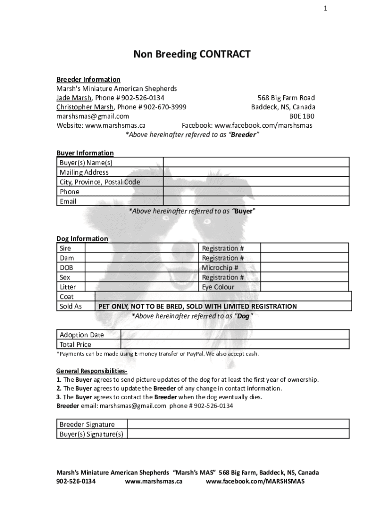 1Non Breeding CONTRACT Breeder Information Marsh\'s Miniature American Shepherds Jade Marsh, Phone # 9025260134 568 Big Farm Road Christopher Marsh, Phone # 9026703999 Bad deck, NS, Canada marshsmas@gmail.com