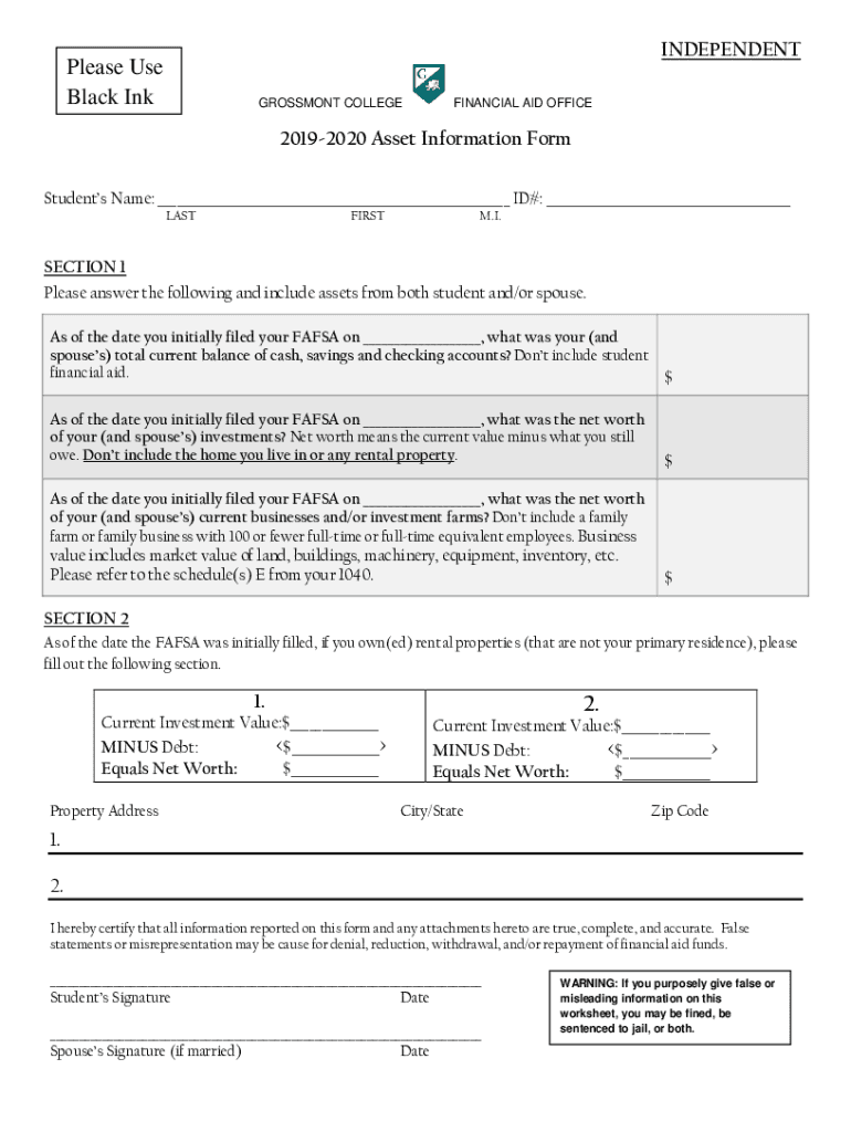 Black Engrossment COLLEGEFINANCIAL AID OFFICE20192020 Asset Information Form