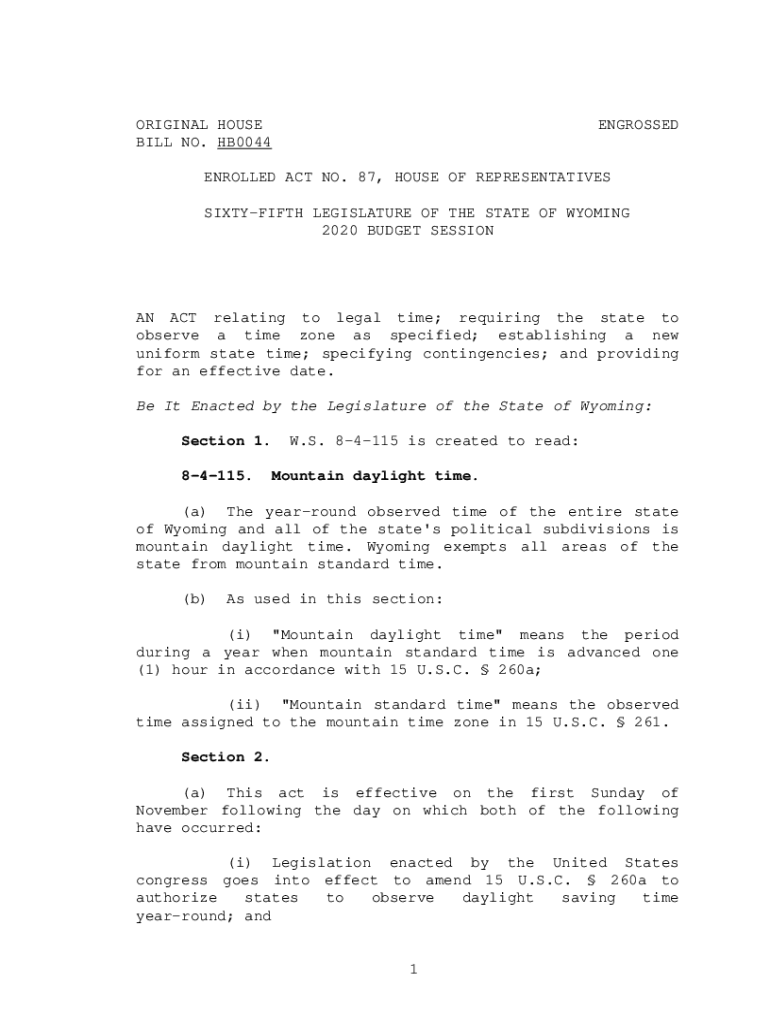 ORIGINAL HOUSE BILL NO. HB0044ENGROSSEDENROLLED ACT NO. 87, HOUSE OF REPRESENTATIVES SIXTIETH LEGISLATURE OF THE STATE OF WYOMING 2020 BUDGET SESSION AN ACT relating to legal time; requiring the state