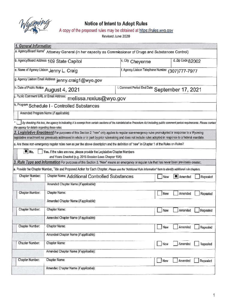 Notice of Intent to Adopt Rules A copy of the proposed rules may be obtained at https://rules.wyo.gov Revised June 20201. General Information a. Agency/Board Name* Attorney General (in her capacity