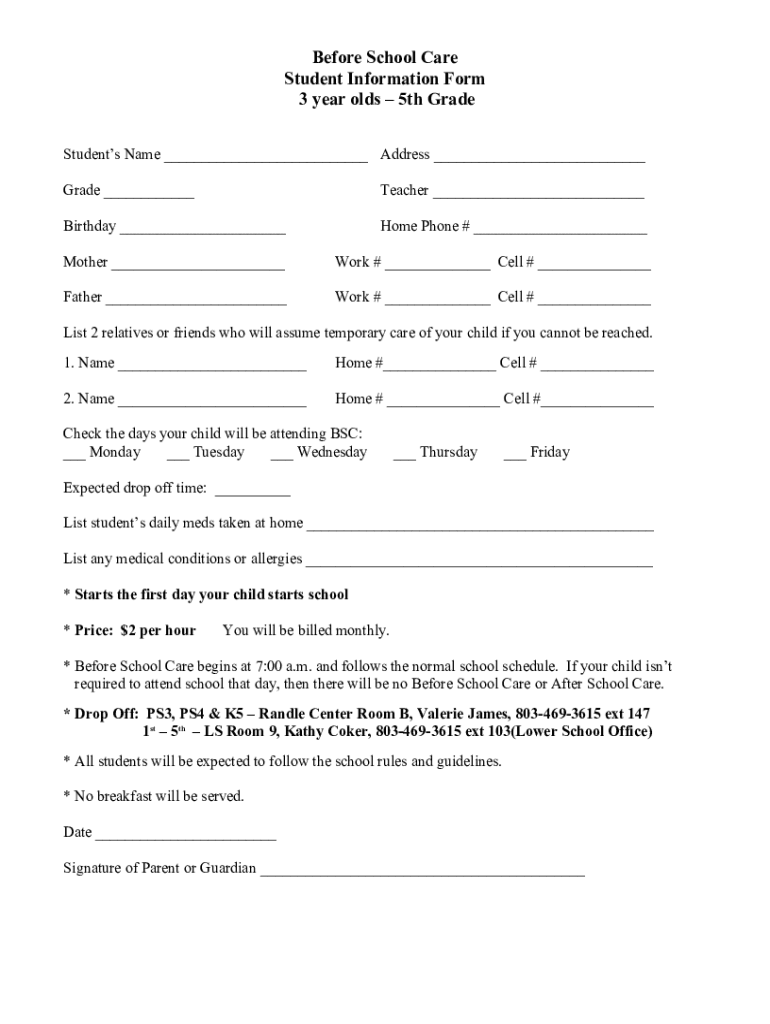 Before School Care Student Information Form 3-year-olds 5th Grade Students Name ___ Address ___ Grade ___Teacher ___Birthday ___Home Phone # ___Mother ___Work # ___ Cell # ___Father ___Work # ___