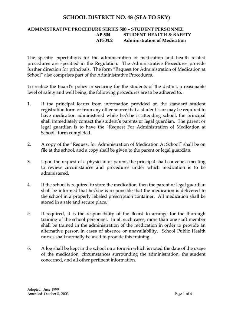 SCHOOL DISTRICT NO. 48 (SEA TO SKY) ADMINISTRATIVE PROCEDURE SERIES 500 STUDENT PERSONNEL AP 504 STUDENT HEALTH & SAFETY AP504.2 Administration of Medication The specific expectations for the administration