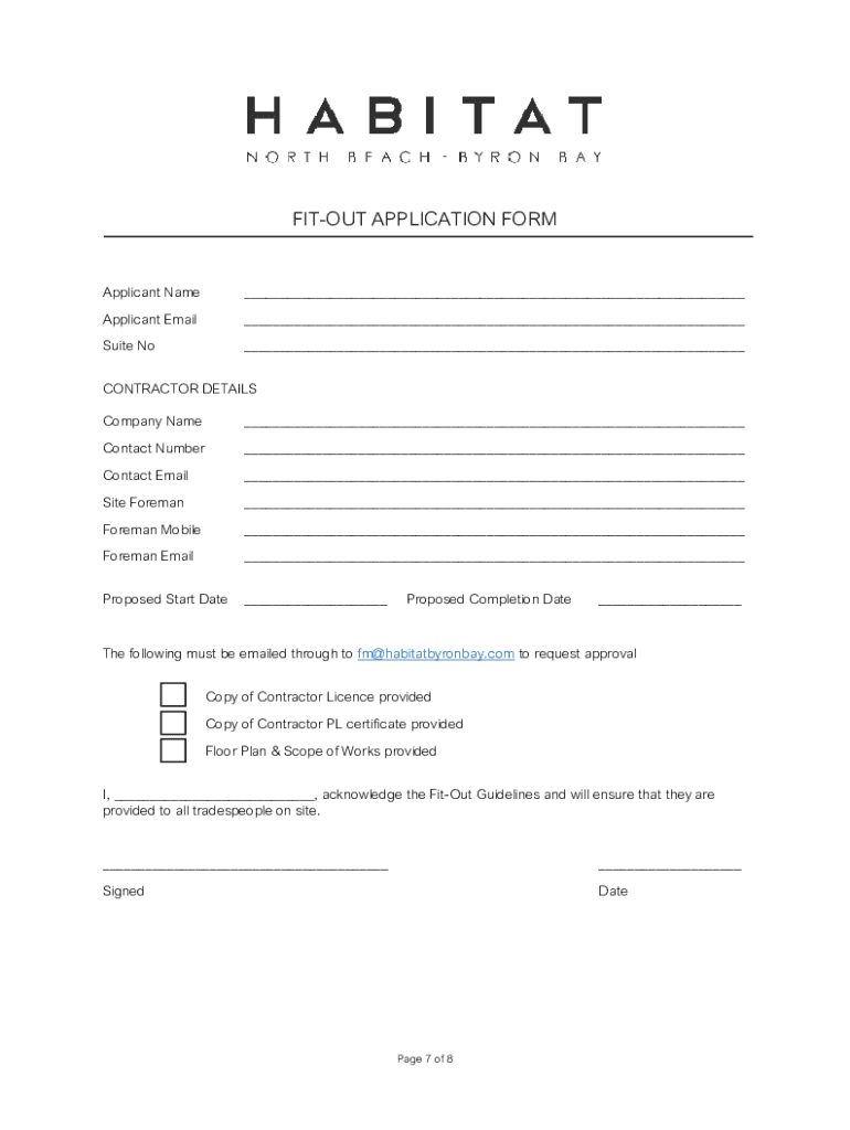 The fit-out application form may require details such as the scope of work, timeline for completion, contractor information, insurance details, and any necessary permits.
