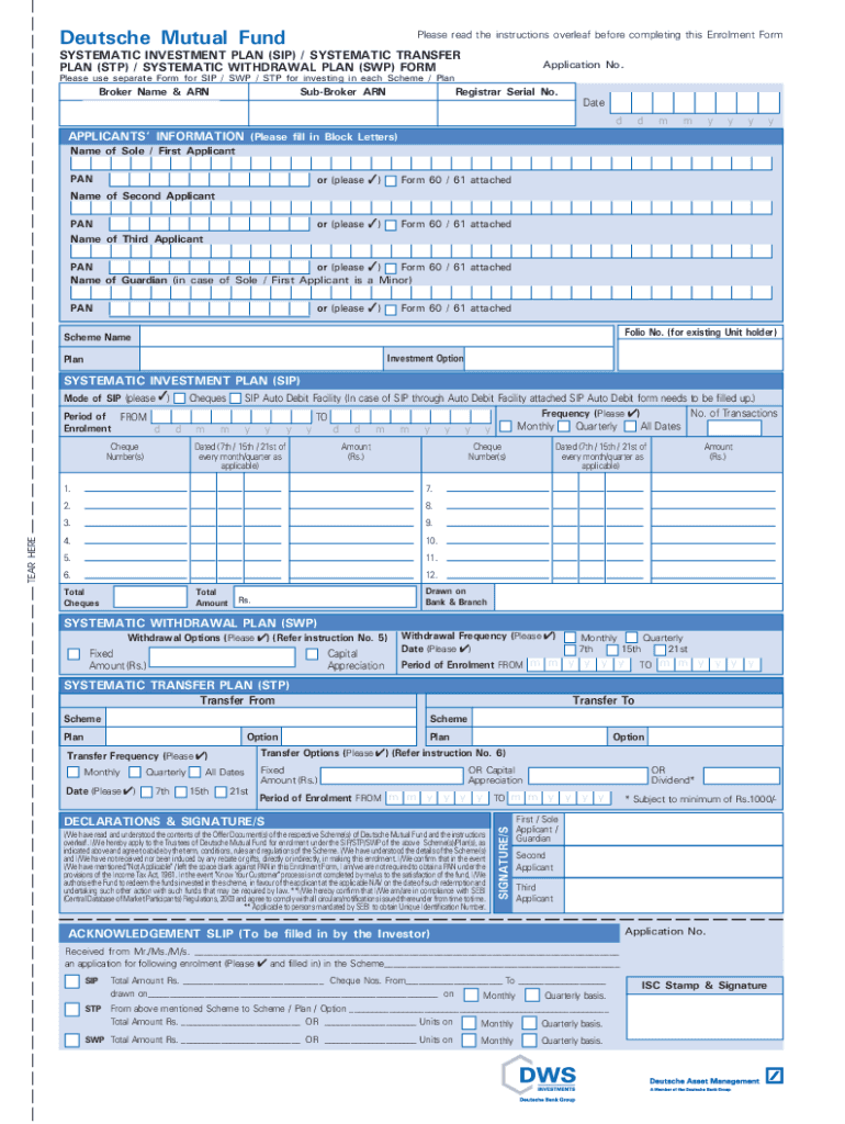 Deutsche Mutual Unpleased read the instructions overleaf before completing this Enrollment FormSYSTEMATIC INVESTMENT PLAN (SIP) / SYSTEMATIC TRANSFER