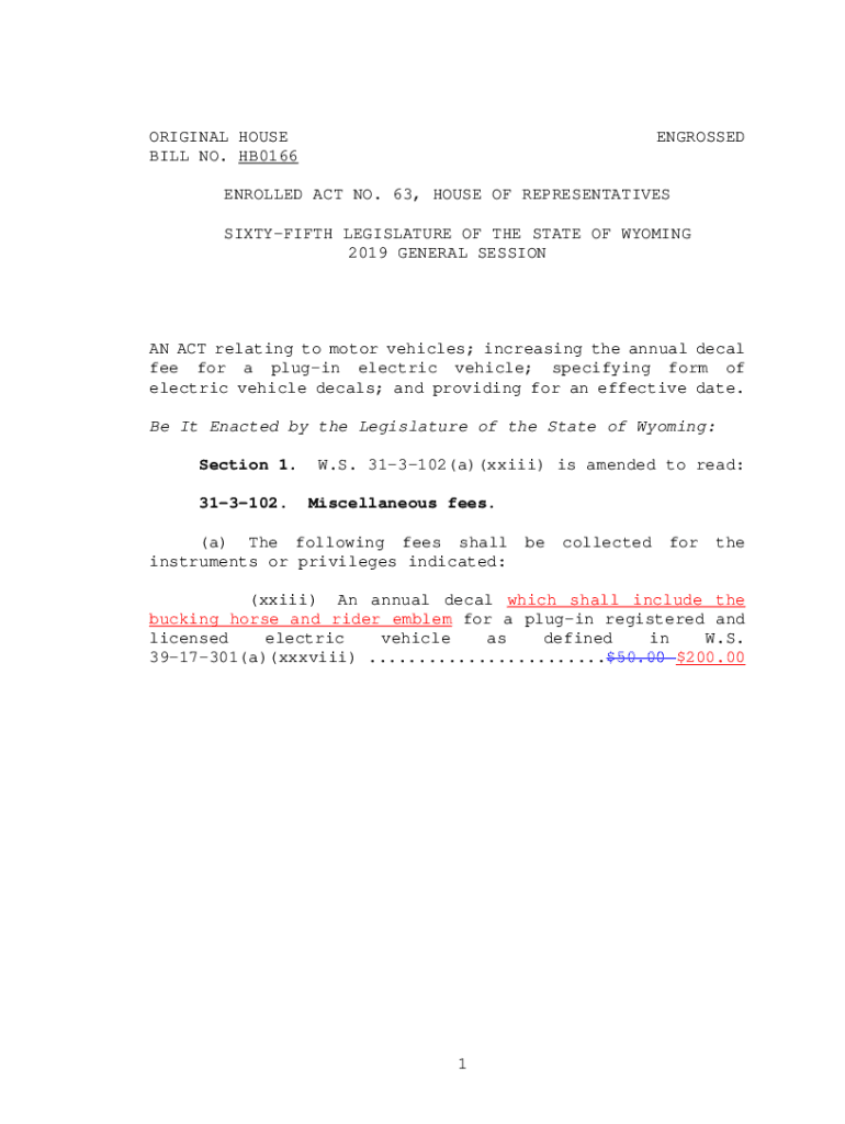 ORIGINAL HOUSE BILL NO. HB0166ENGROSSEDENROLLED ACT NO. 63, HOUSE OF REPRESENTATIVES SIXTIETH LEGISLATURE OF THE STATE OF WYOMING 2019 GENERAL SESSION AN ACT relating to motor vehicles; increasing