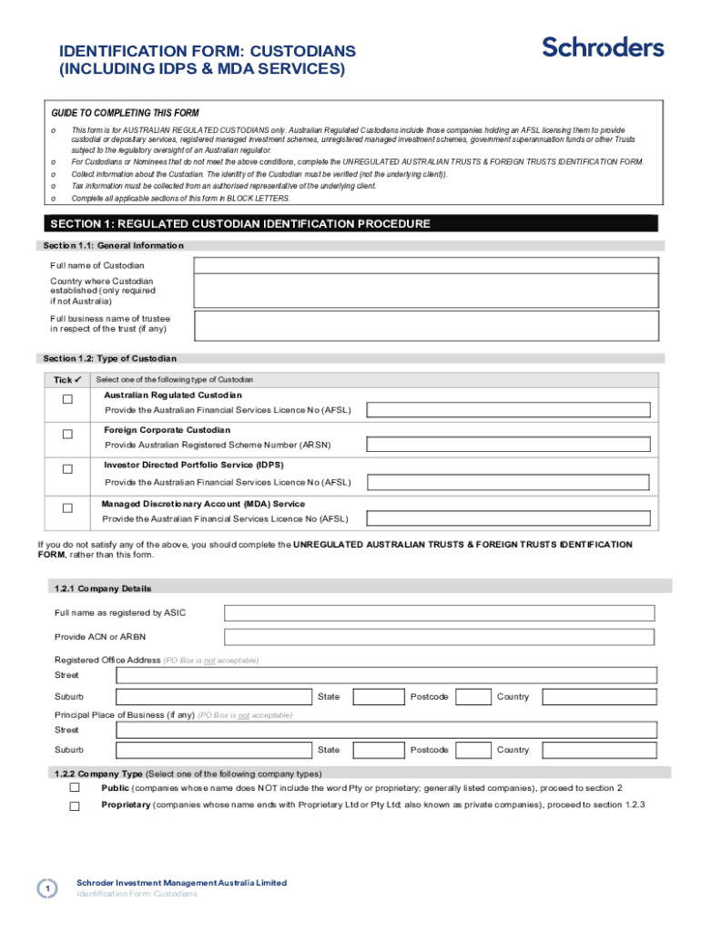 IDENTIFICATION FORM: CUSTODIANS (INCLUDING IDPs & MDA(Including SERVICES) IDPs and MDA services) GUIDE TO COMPLETING THIS FOR Moo o this form is for AUSTRALIAN REGULATED CUSTODIANS only. Australian
