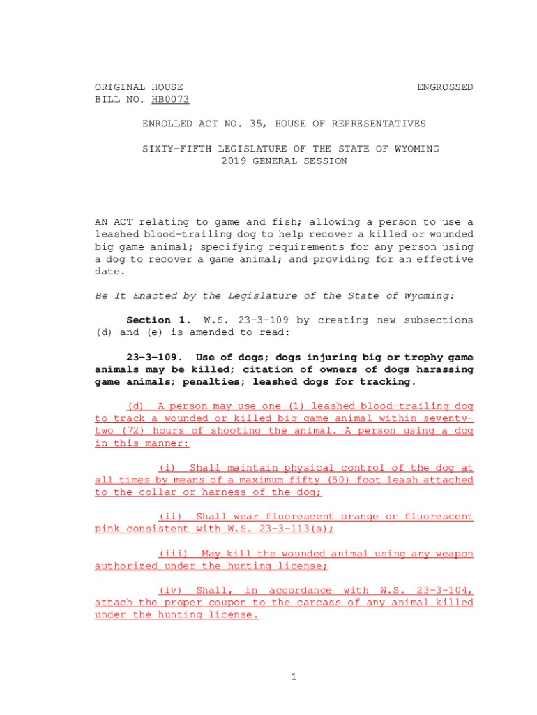 ORIGINAL HOUSE BILL NO. HB0073ENGROSSEDENROLLED ACT NO. 35, HOUSE OF REPRESENTATIVES SIXTIETH LEGISLATURE OF THE STATE OF WYOMING 2019 GENERAL SESSION AN ACT relating to game and fish; allowing a