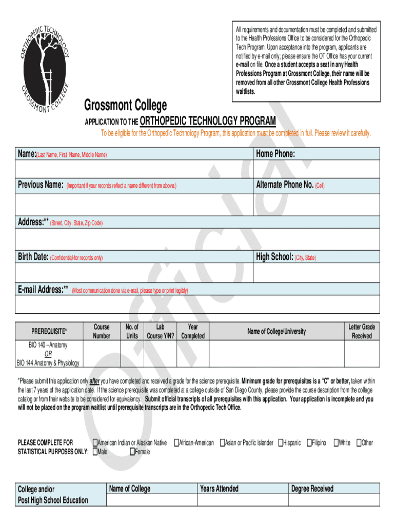 All requirements and documentation must be completed and submitted to the Health Professions Office to be considered for the Orthopedic Tech Program. Upon acceptance into the program, applicants are