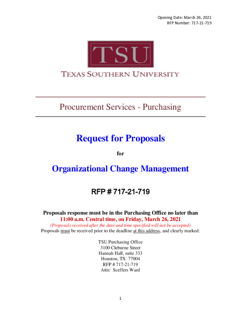 Opening Date: March 26, 2021, RFP Number: 71721719Procurement Services PurchasingRequest for Proposals organizational Change Management RFP # 71721719 Proposals response must be in the Purchasing