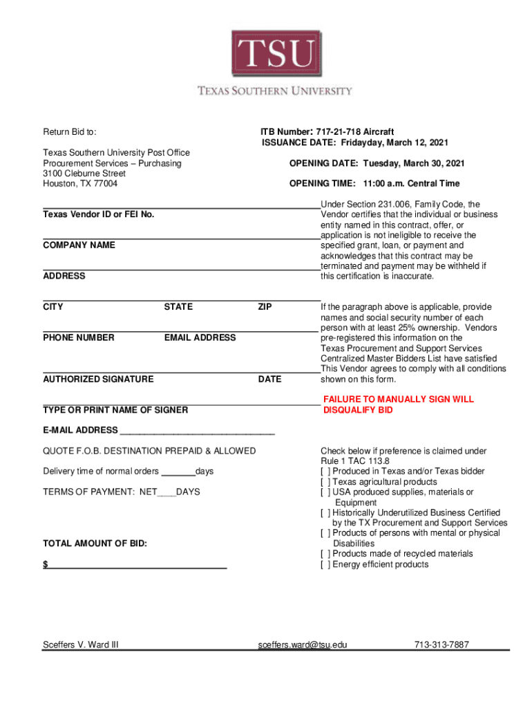 ITB Number: 71721718 Aircraft ISSUANCE DATE: Friday day, March 12, 2021Return Bid to: Texas Southern University Post Office Procurement Services Purchasing 3100 Cliburn Street Houston, TX 77004OPENING