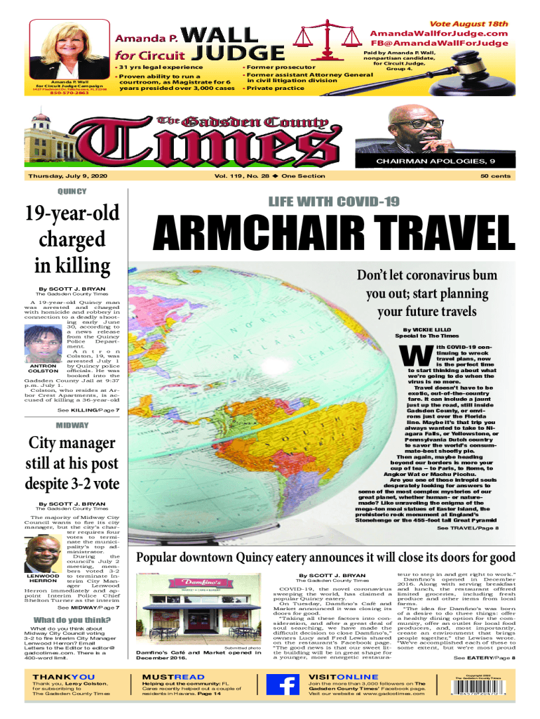 WWW.NARCOTIZES.THURSDAY, JULY 9, 2020, PAGE 1GADSDEN COUNTY Limestone August 18thAmandaWallforJudge.com FB@AmandaWallForJudgeAmanda P. Paid by Amanda P. Wall, nonpartisan candidate, for Circuit Judge,